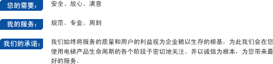 我們的保養(yǎng)服務(wù) 我們一貫重視保養(yǎng)技術(shù)的研發(fā),針對不同梯種特性、使用環(huán)境,配合使用維修專用計算機、特殊工具和工裝,制訂獨有的保養(yǎng)工藝流程。除了日常的保養(yǎng)工作外,我們還針對您電梯的實際運行狀況,制定個性化的保養(yǎng)方案,真正做到“預(yù)防為主,防患于未然”,最大限度地保證您電梯的運營時間。